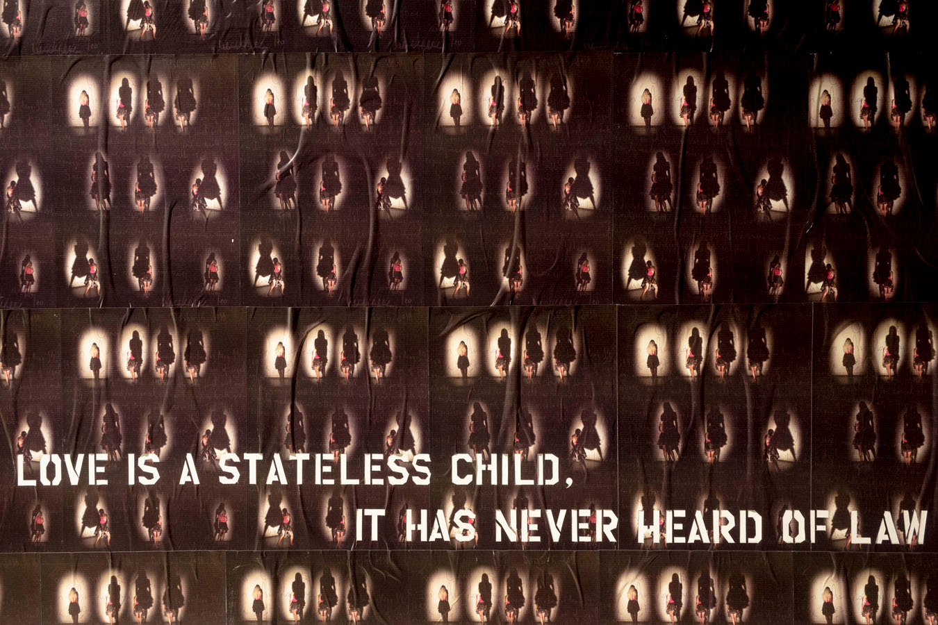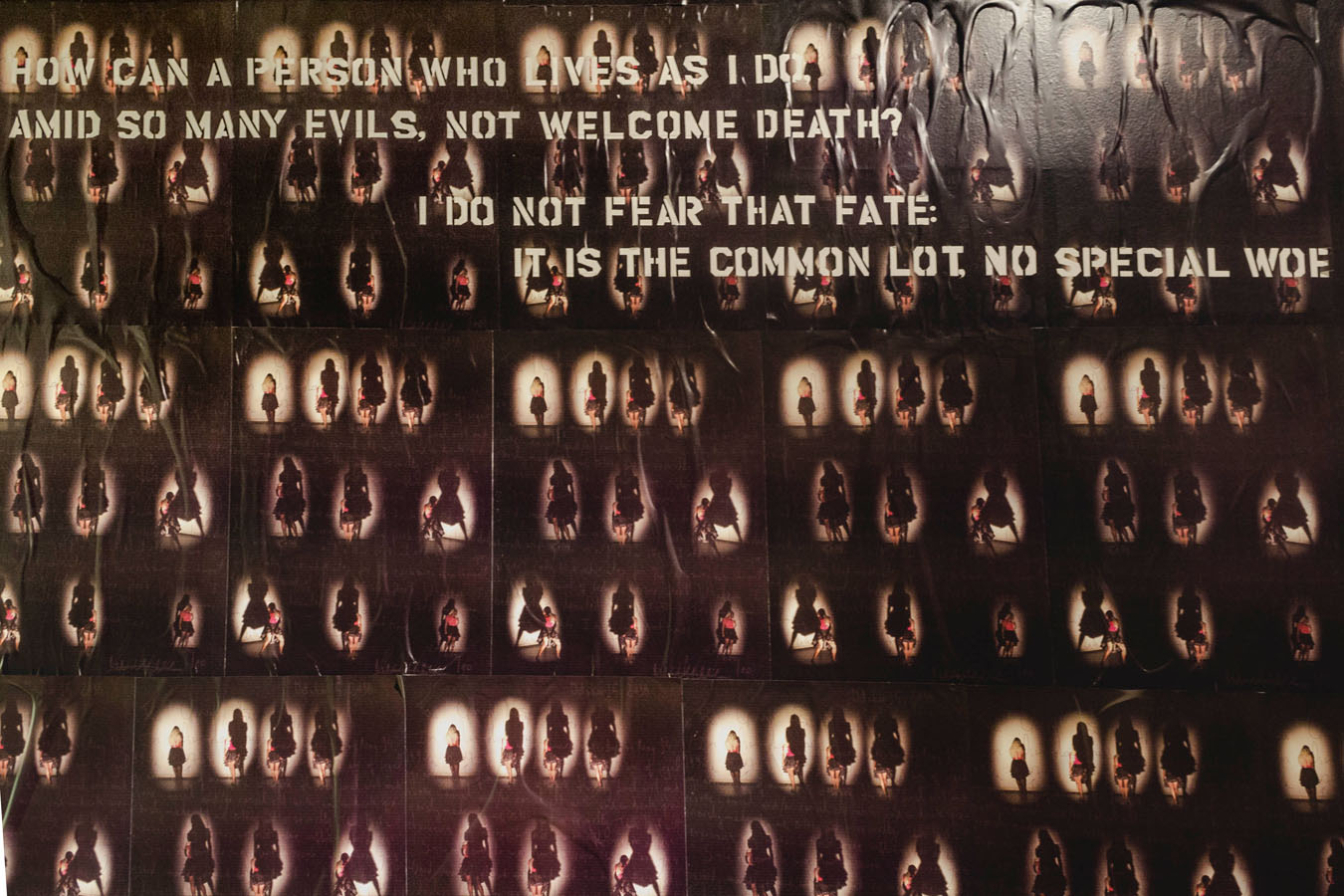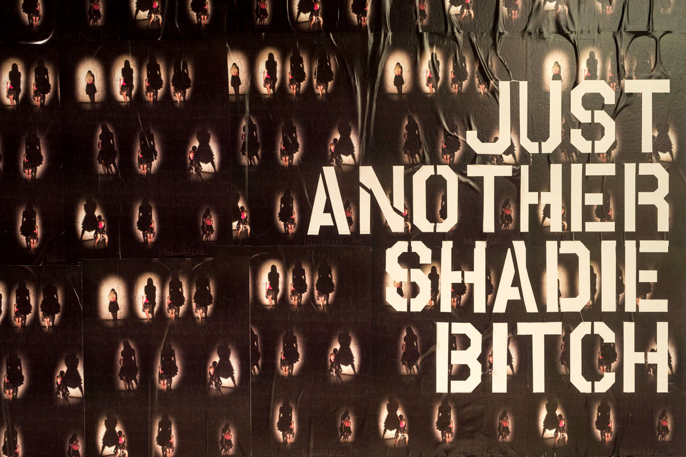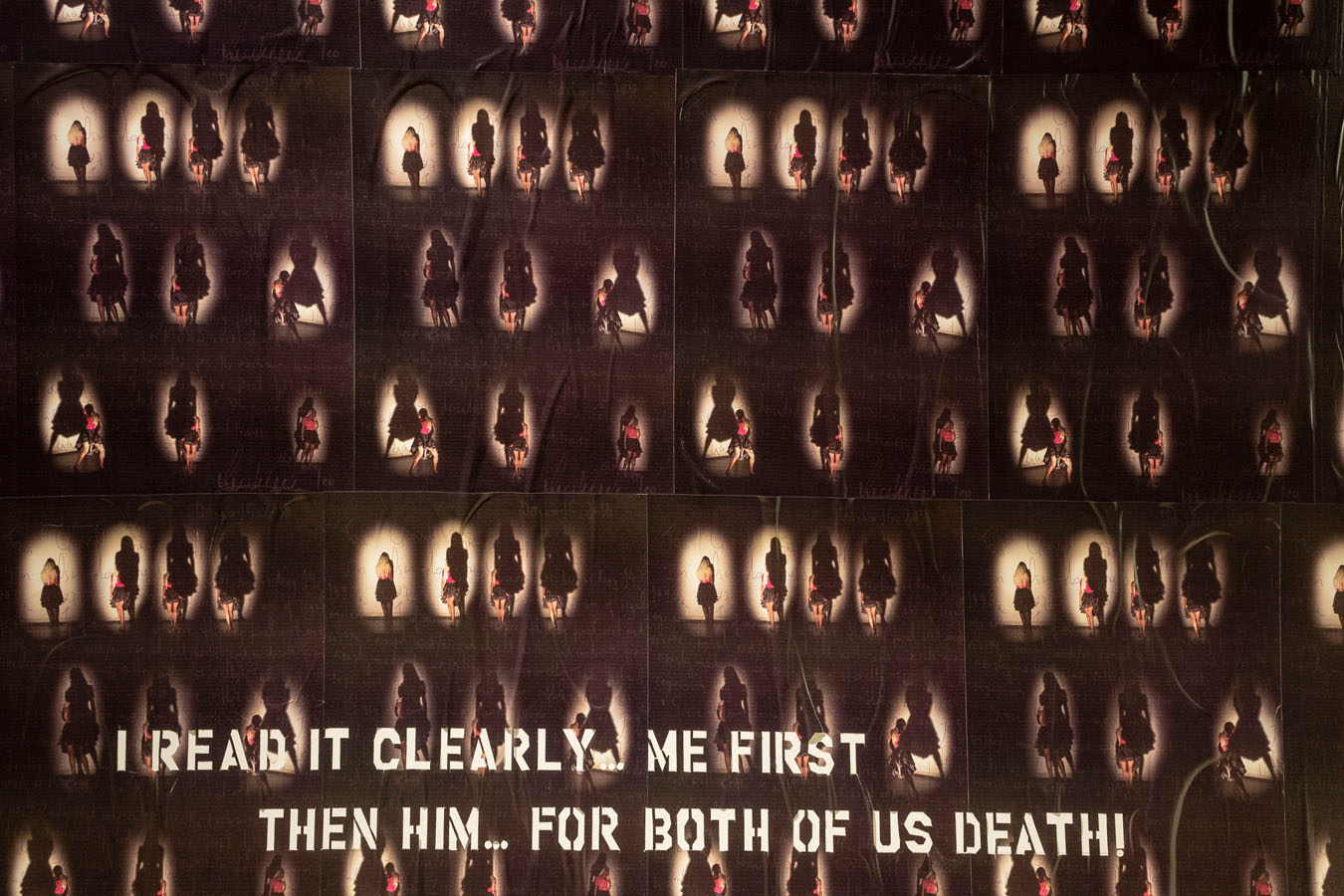 Act I of “Just Another Shadie Bitch” situates extracts from Antigone and Carmen within the exhibition space using paper cuts applied to the walls as a method of inscription. The textual fragments establish a positive/negative interplay with the wall surface, foregrounding the materiality of language.