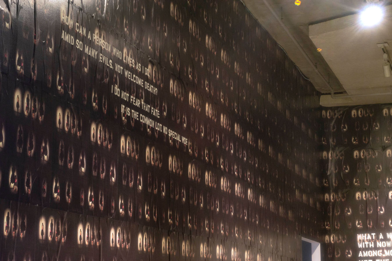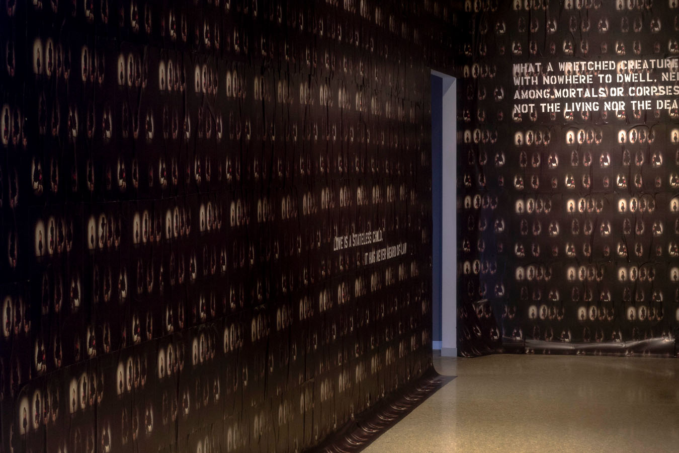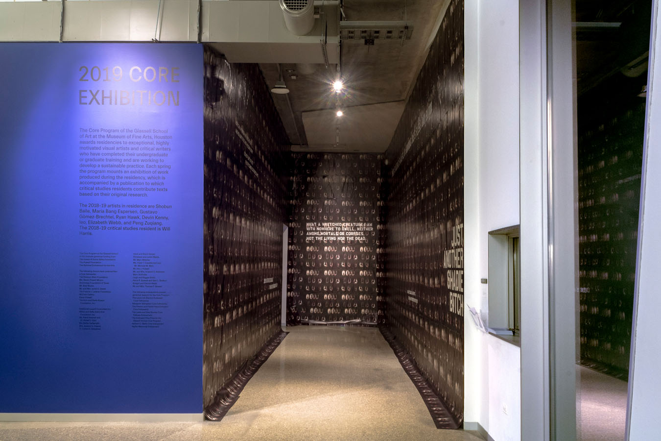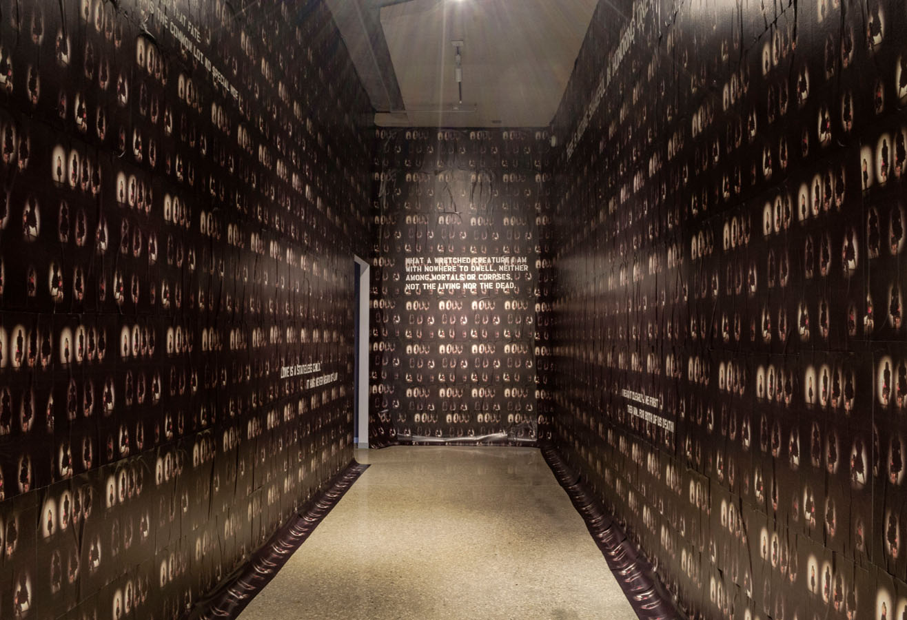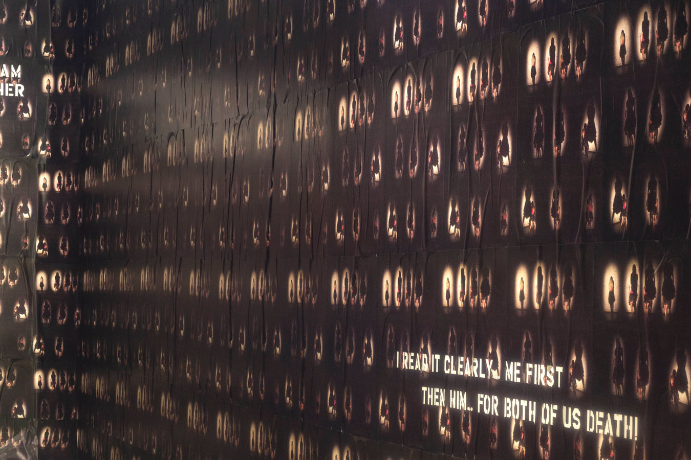 Act I of “Just Another Shadie Bitch” situates extracts from Antigone and Carmen within the exhibition space using paper cuts applied to the walls as a method of inscription. The textual fragments establish a positive/negative interplay with the wall surface, foregrounding the materiality of language.