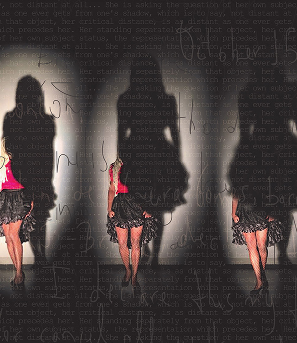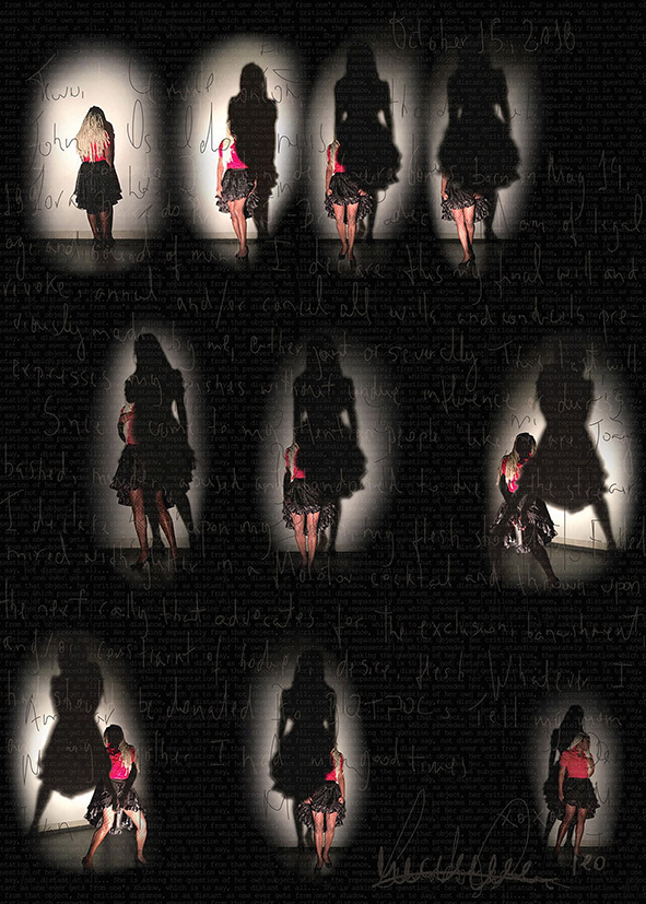 The Prelude to “Just Another Shadie Bitch” assembles photographic stills from a five-minute pitch performance alongside textual materials, including a list of names, a last will, and an extract from Rebecca Schneider’s book The Explicit Body in Performance. These elements form a layered visual and textual field that negotiates performance, writing, and life, situating the work as a point of entry into the multimedia opera’s narrative and conceptual concerns.
