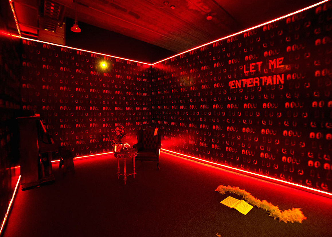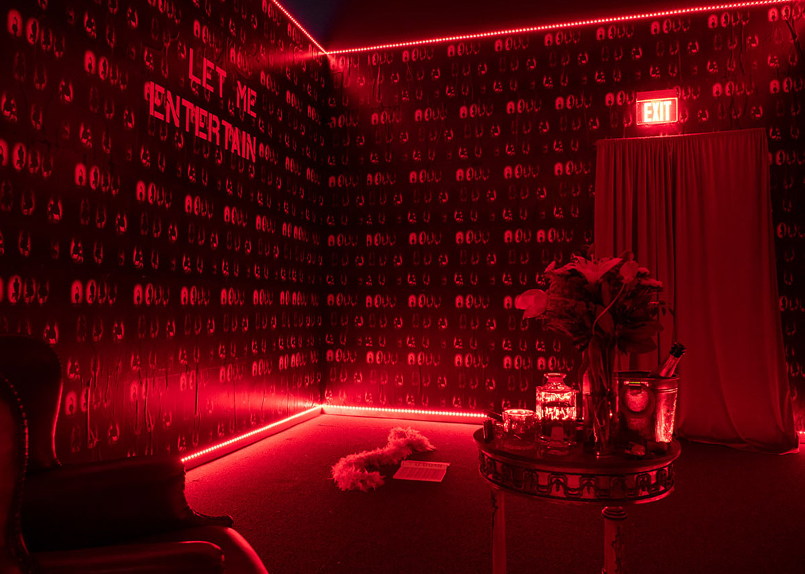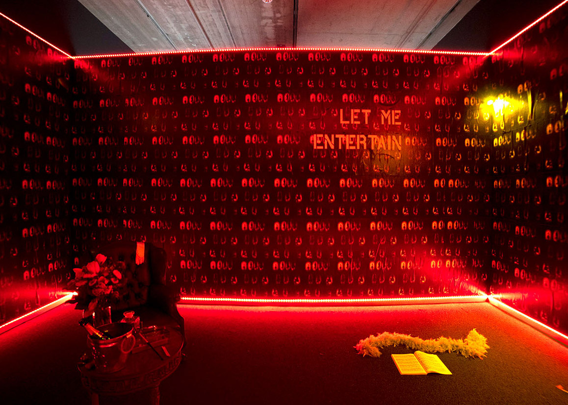 Act II of “Just Another Shadie Bitch” is an immersive installation examining performativity, social relationships, and scene-making. It engages scenographic tropes of burlesque and cabaret, translating elements of Greek tragedy, opera, and social drama into spatialized, performative interactions that reframe an audience’s perception and situate narrative and space in dialogue.
