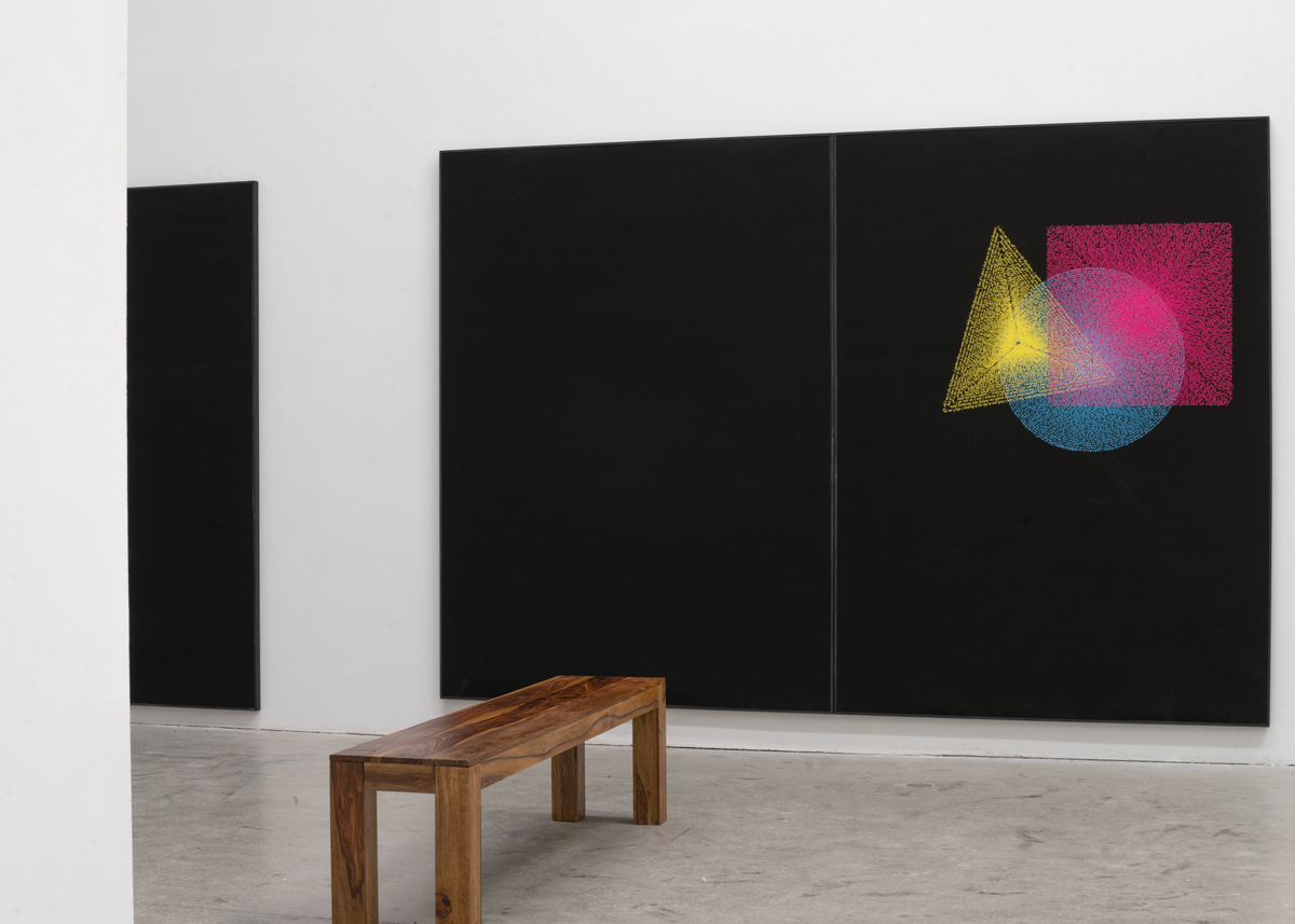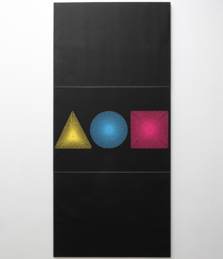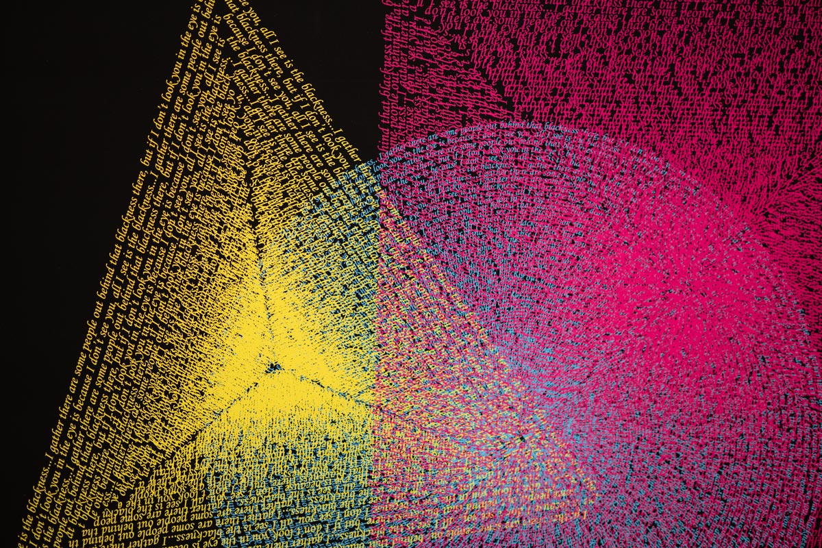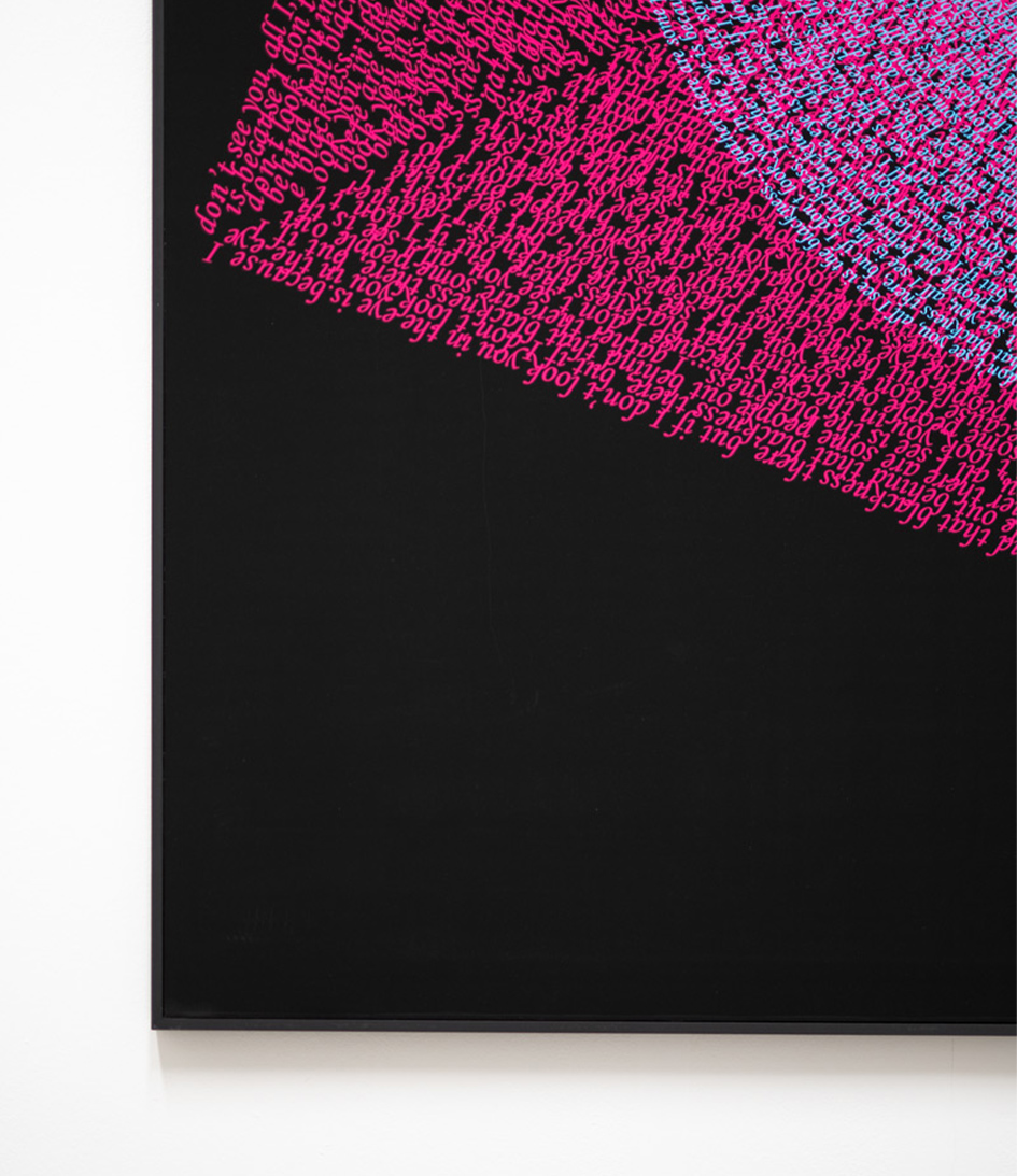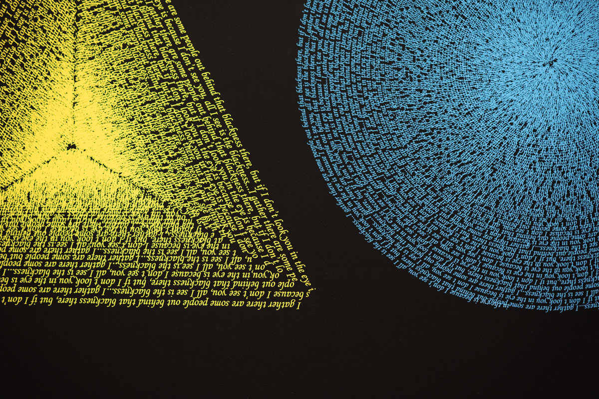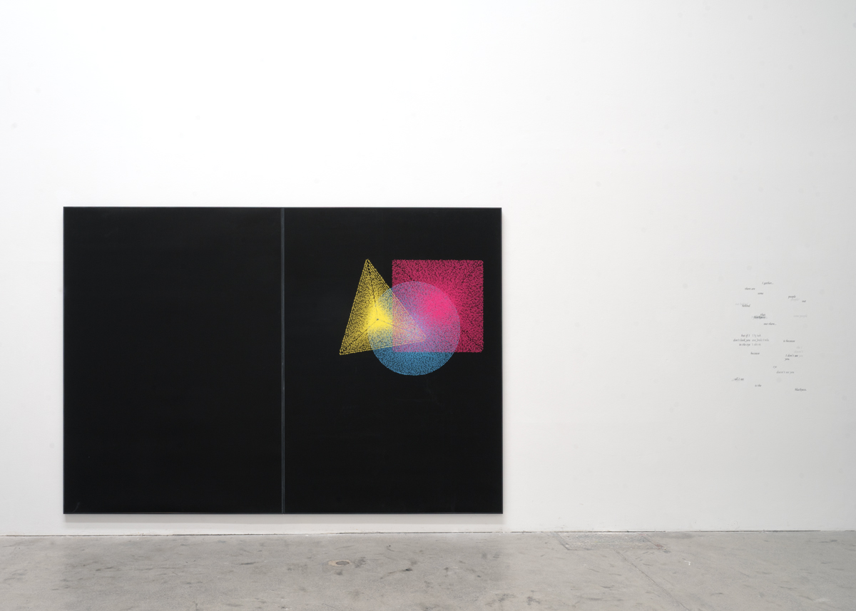 Temple is an installation that comprises Graphic Compositions, a print series, which transposes Wassily Kandinsky’s color theory (that primary shapes correspond with specific primary colors) to digital printing techniques. The shapes, which are distinctly formed by colour, are composed of a sentence once spoken by linguist and political scientist Noam Chomsky, while addressing a visually indiscernible audience: “I gather there are some people out behind that blackness there… but if I don’t look you in the eye, it’s because I don’t see you. All I see is the blackness.”