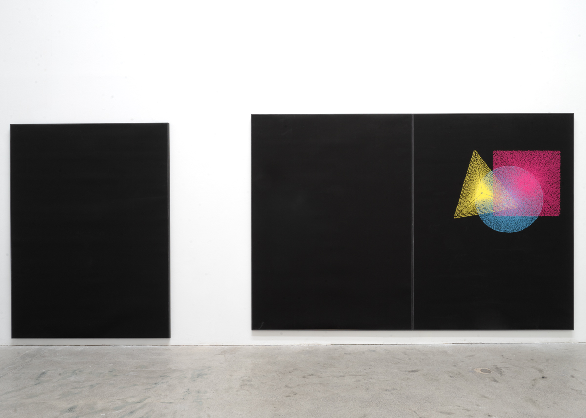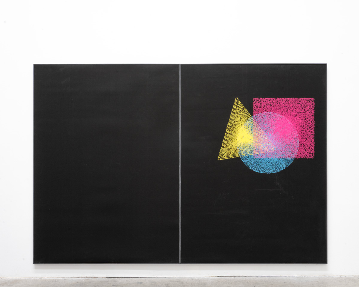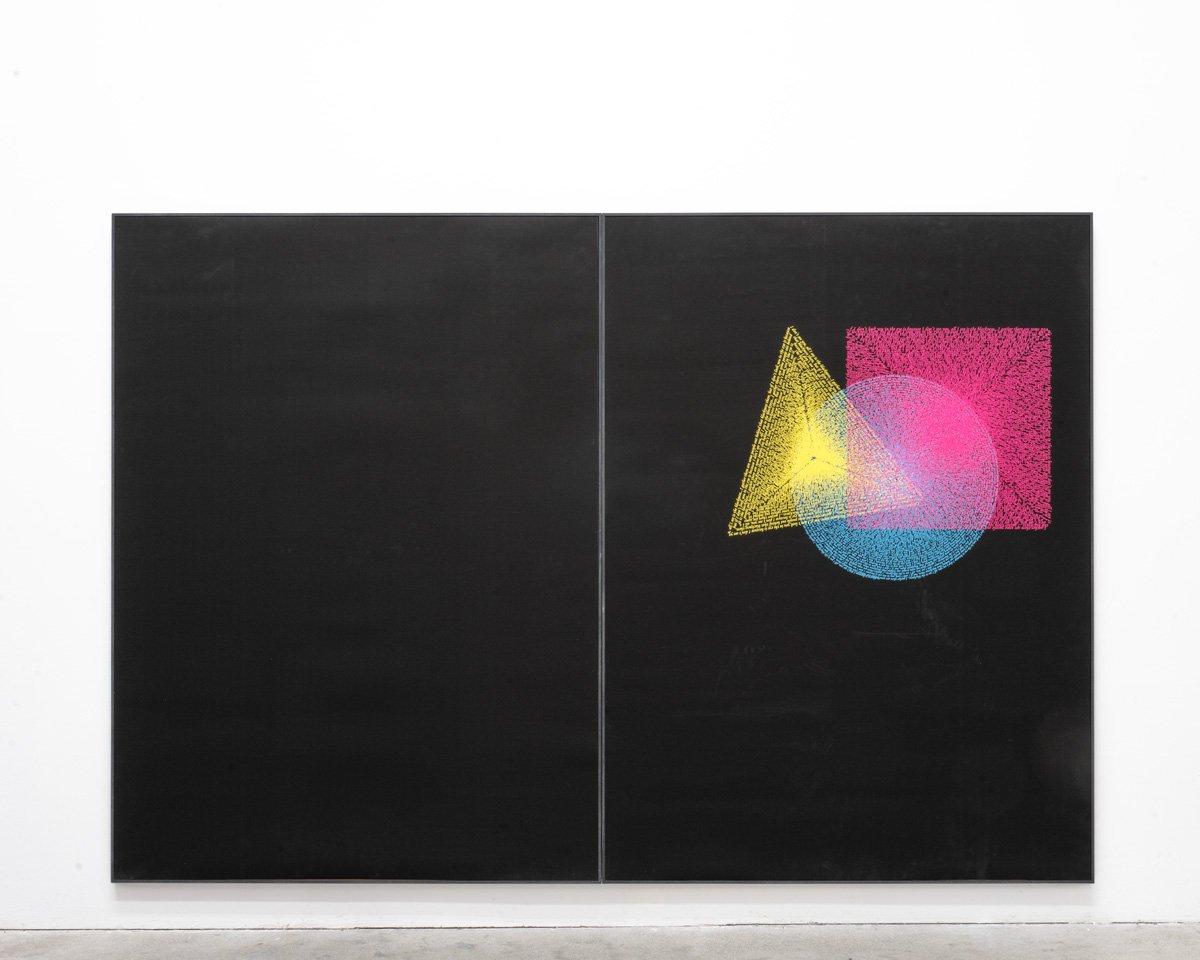 Using cyan, magenta, and yellow as the primary colors, a circle, a square, and a triangle become case studies in harmony, balance, and movement on paper. The shapes are presented against a black background, upon which the vibrancy of the shape, colour and text is intensified, subverting Kandinsky’s proposition that the ‘colour’ black approximates nothingness and foregrounding Chomsky’s slippage with language. The title of these prints plays on the word graphic, which can refer to the graphic arts, and be a euphemism for something explicitly offensive or obscene. leo’s formal consideration subtly plays with perceptions of race and aesthetics, raising questions towards the possibility of representation under visual regimes of scrutiny and prejudice.