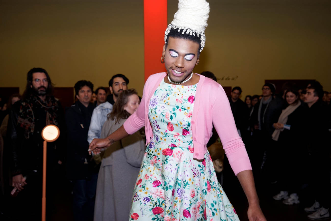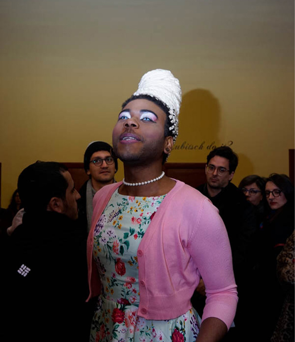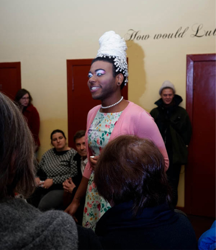A book club meeting hosted by leo. The hostess speaks a text that adapts a literary trope to question power relations inscribed in literacy. Reading from a book, leo explains the “Talking Book” trope as developed by Henry Louis Gates Jr., and uses “Yo’ Mama” jokes to probe the political dimensions of language. leo extends the questioning of literacy by learning how to speak “like a lady” together with Audrey Hepburn in an extract of the film My Fair Lady (1964), which tells the story of a bet surrounding a stereotypical young female worker and her transformation into a conventional high society lady. [text by Vanessa Gravenor]